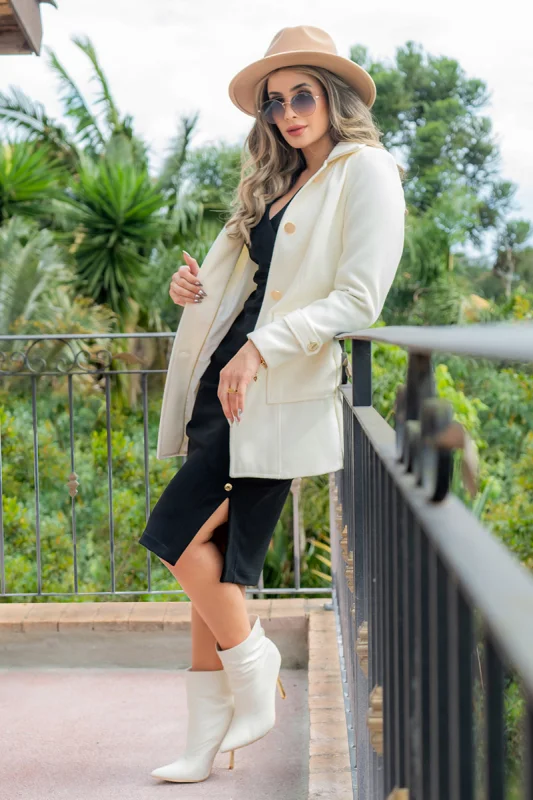 O blazer alfaiataria off white combina sofisticação suave com estética contemporânea, ideal para quem busca leveza visual sem perder autoridade profissional.