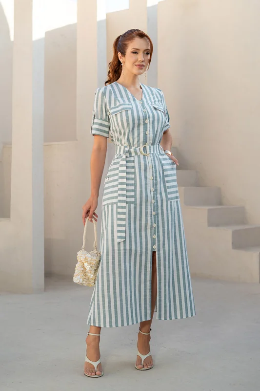 A curadoria privilegia vestidos midi com caimento refinado, evitando excessos e preservando dignidade visual.