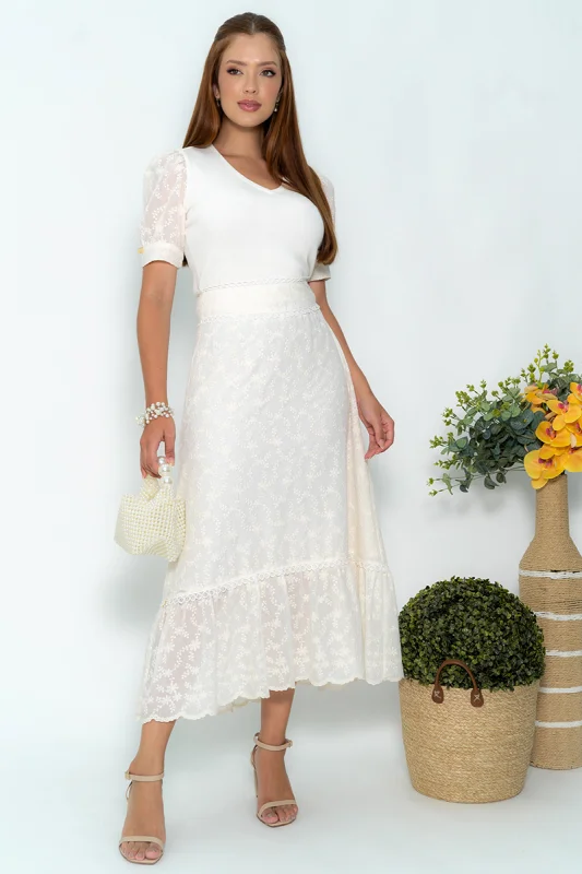O vestido é o destaque, oferecendo conforto, beleza e caimento preciso.