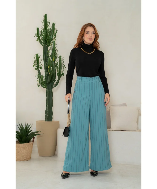 A calça prioriza cintura confortável e caimento que valoriza postura, enquanto a blusa evita transparências e mantém proporção visual equilibrada.