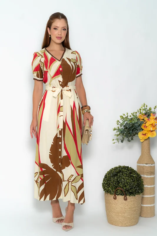 Materiais como crepe, laise, renda e linho são frequentemente empregados, proporcionando fluidez, leveza e um toque de sofisticação aos vestidos.
