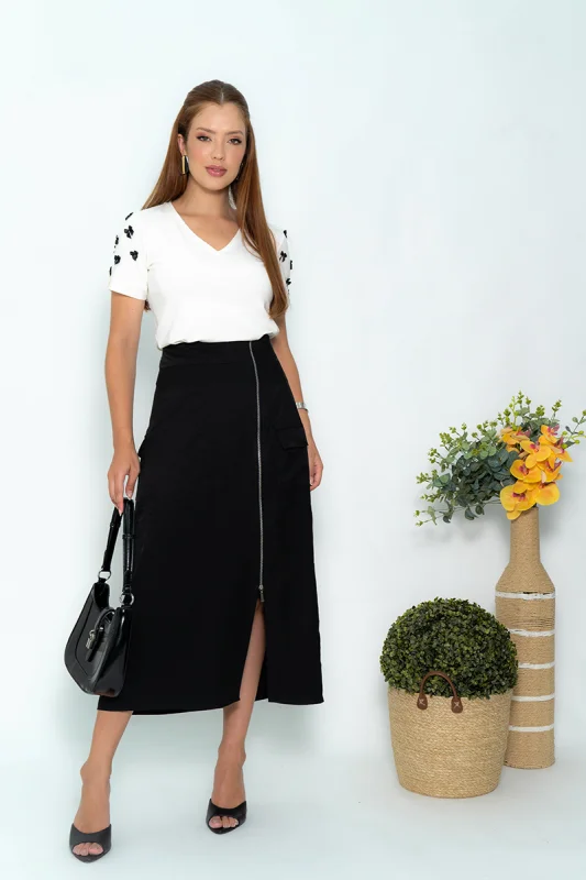 - Versatilidade e Elegância: Com a possibilidade de usar blazers, camisas e scarpins, essa saia se torna um item coringa no guarda-roupa feminino, permitindo a criação de diferentes composições para o ambiente corporativo.