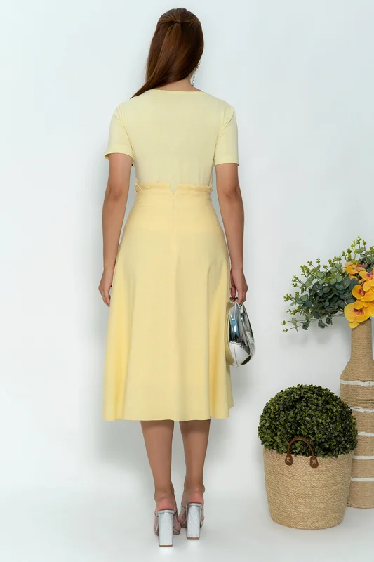 A saia midi de linho cru pode ser combinada de diversas maneiras, criando looks casuais ou mais sofisticados, dependendo da ocasião.