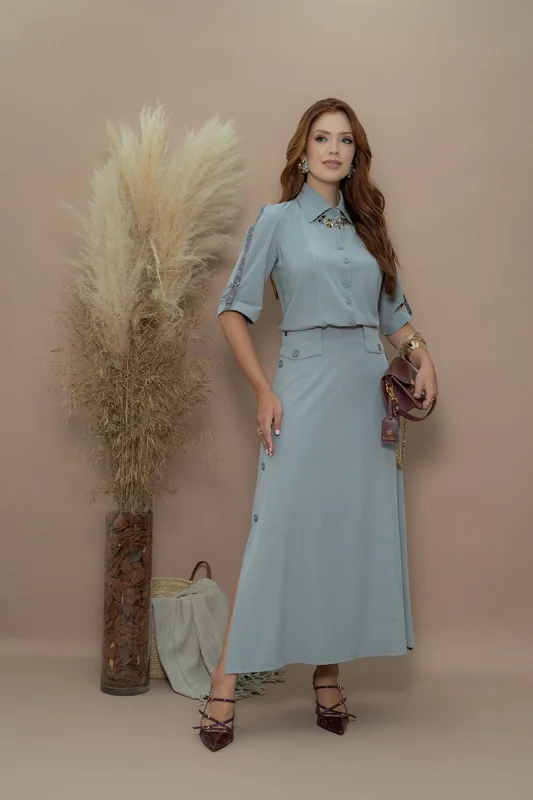 Com foco em vestidos, a marca oferece conforto, caimento impecável e estética adequada para o ambiente profissional e religioso.